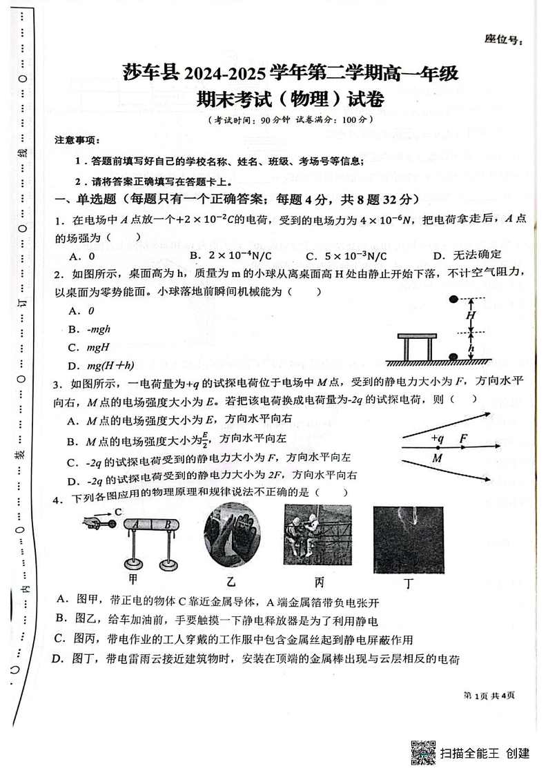 高一物理--新疆喀什地区莎车县2024-2025学年高一下学期7月期末考试