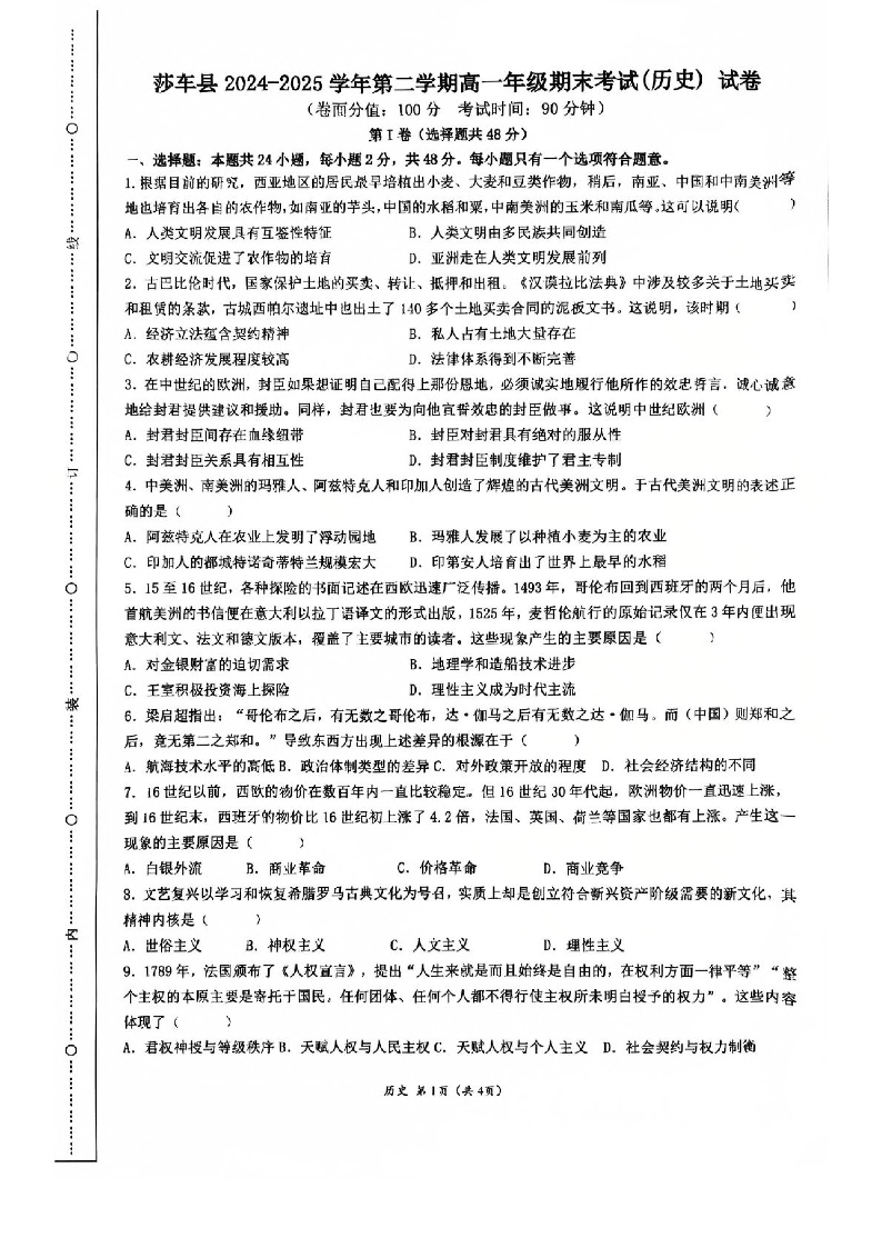高一历史--新疆喀什地区莎车县2024-2025学年高一下学期7月期末考试