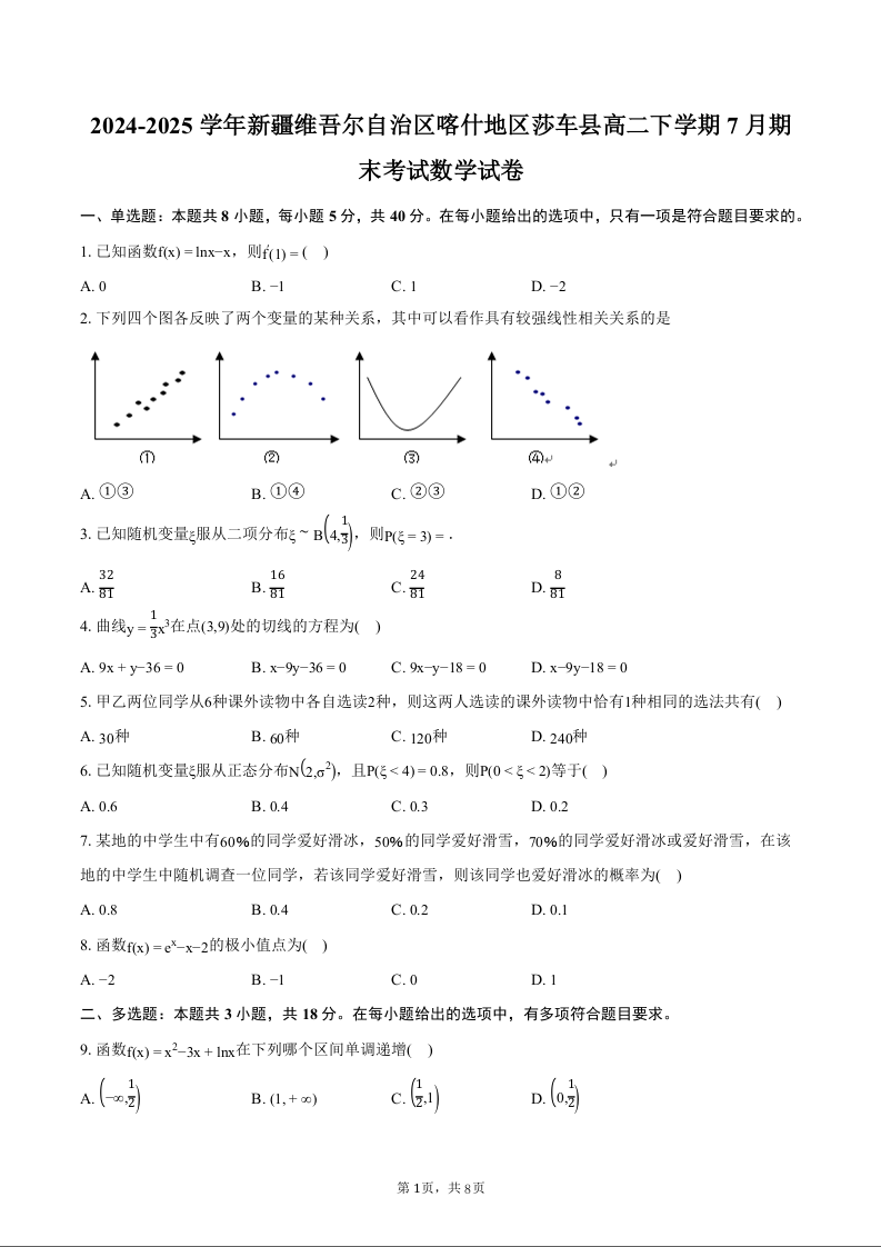 高二数学+答案--新疆喀什地区莎车县2024-2025学年高二下学期7月期末考试