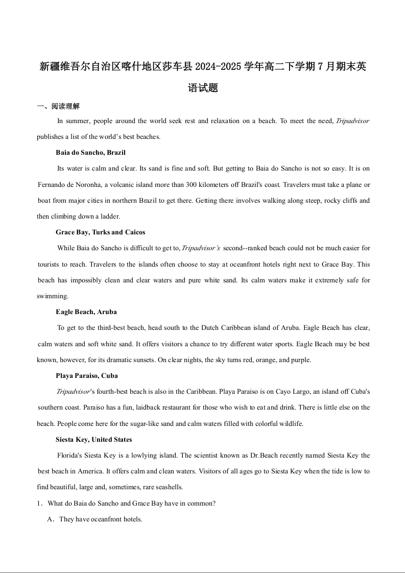 高二英语+答案--新疆喀什地区莎车县2024-2025学年高二下学期7月期末考试