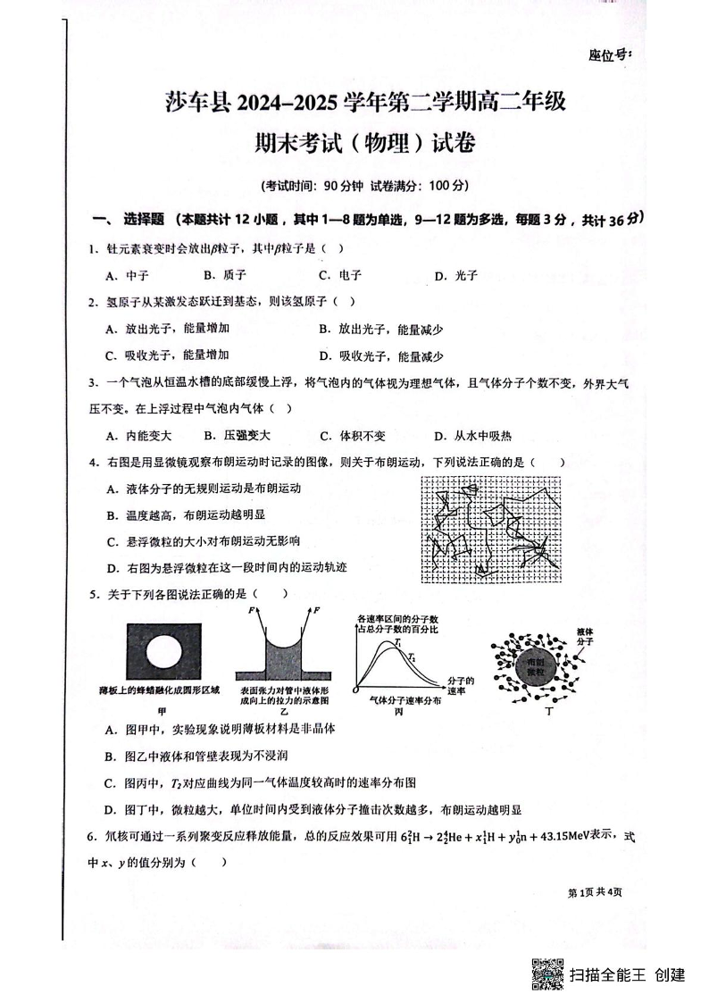 高二物理--新疆喀什地区莎车县2024-2025学年高二下学期7月期末考试