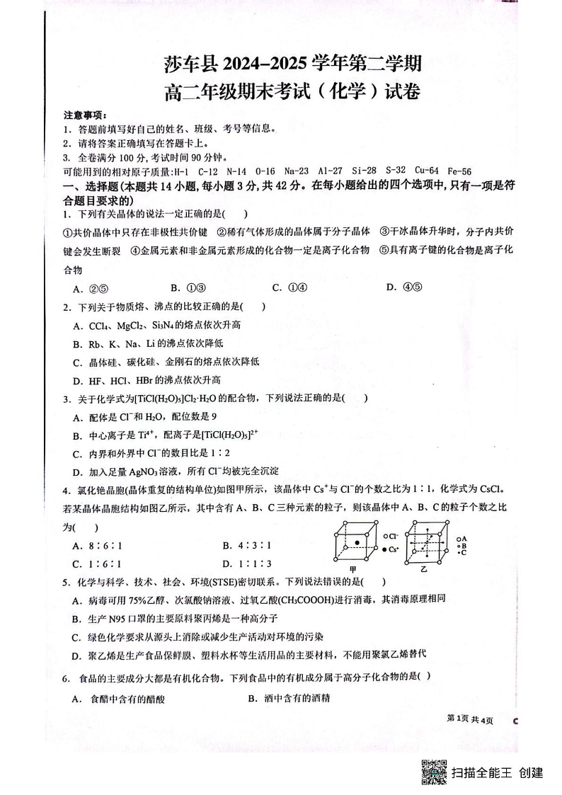 高二化学--新疆喀什地区莎车县2024-2025学年高二下学期7月期末考试