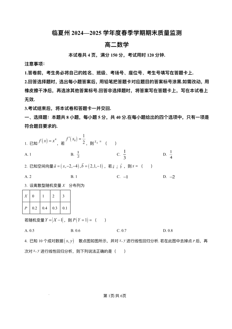 高二数学+答案--甘肃省临夏州2024-2025学年高二下学期期末质量监测