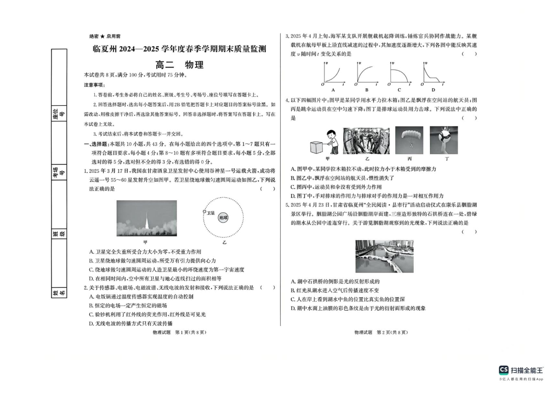 高二物理+答案--甘肃省临夏州2024-2025学年高二下学期期末质量监测