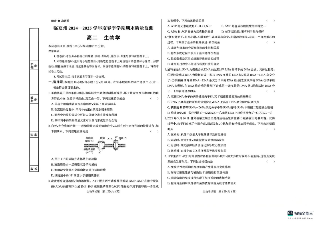 高二生物+答案--甘肃省临夏州2024-2025学年高二下学期期末质量监测