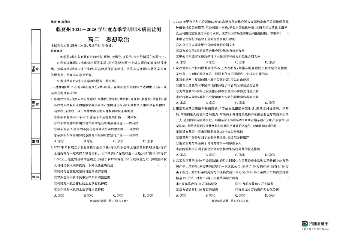 高二政治+答案--甘肃省临夏州2024-2025学年高二下学期期末质量监测