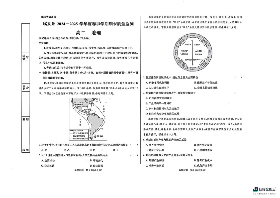 高二地理--甘肃省临夏州2024-2025学年高二下学期期末质量监测