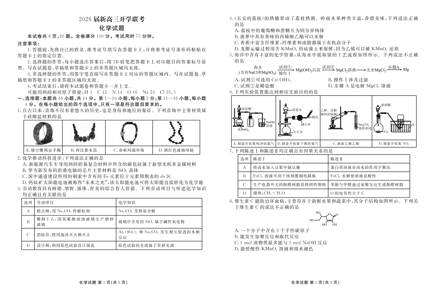 高三化学--广东衡水金卷2026届新高三开学联考
