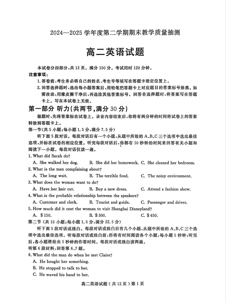 高二英语+答案--山东省聊城市2024-2025学年高二下学期期末考试