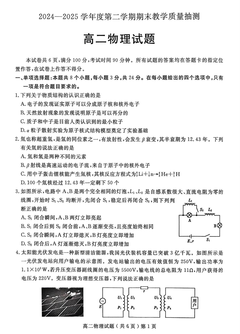 高二物理+答案--山东省聊城市2024-2025学年高二下学期期末考试