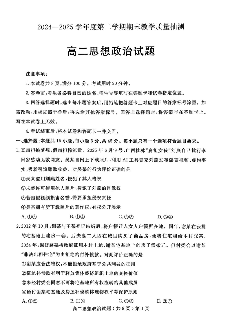 高二政治+答案--山东省聊城市2024-2025学年高二下学期期末考试