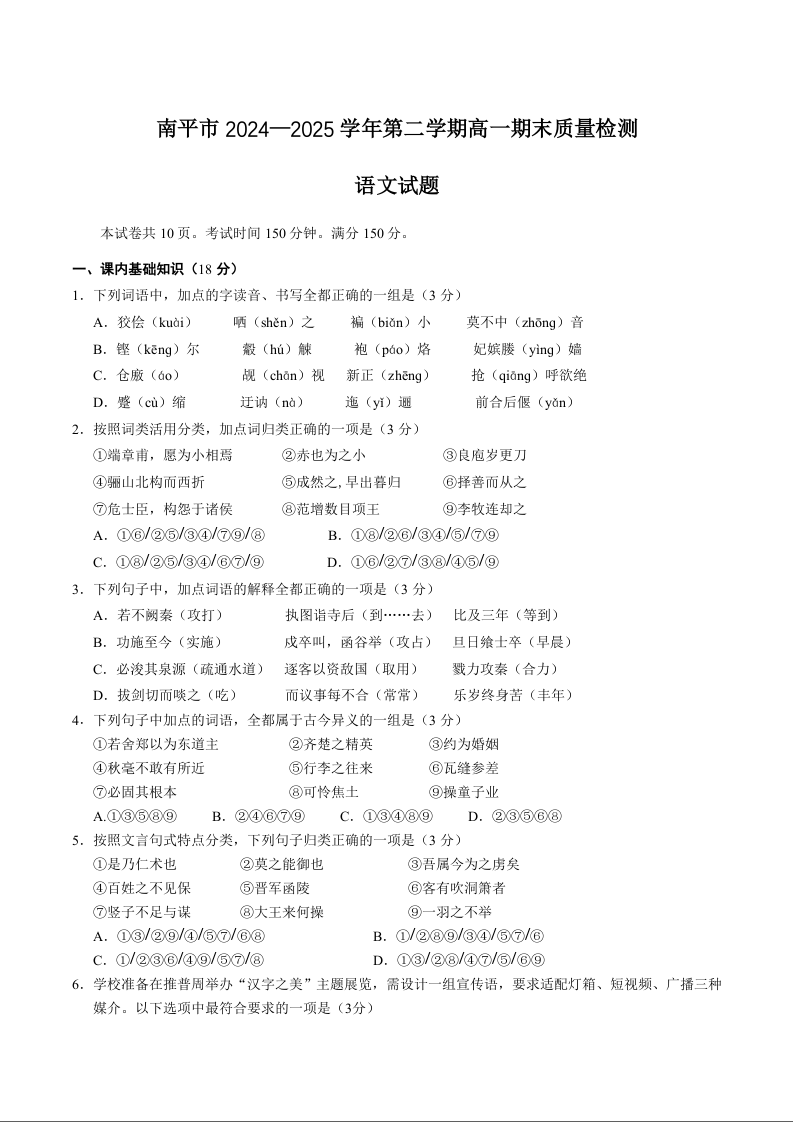 高一语文+答案--福建省南平市2024-2025学年高一下学期期末考试