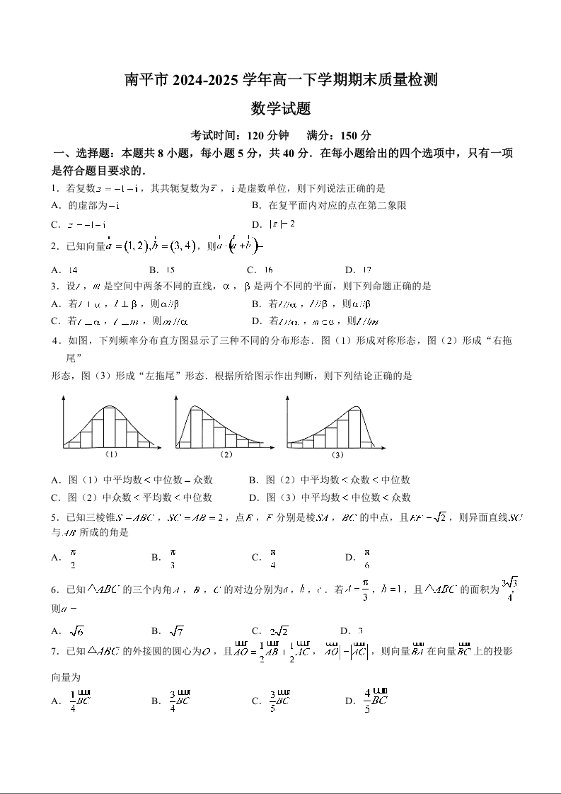 高一数学+答案--福建省南平市2024-2025学年高一下学期期末考试