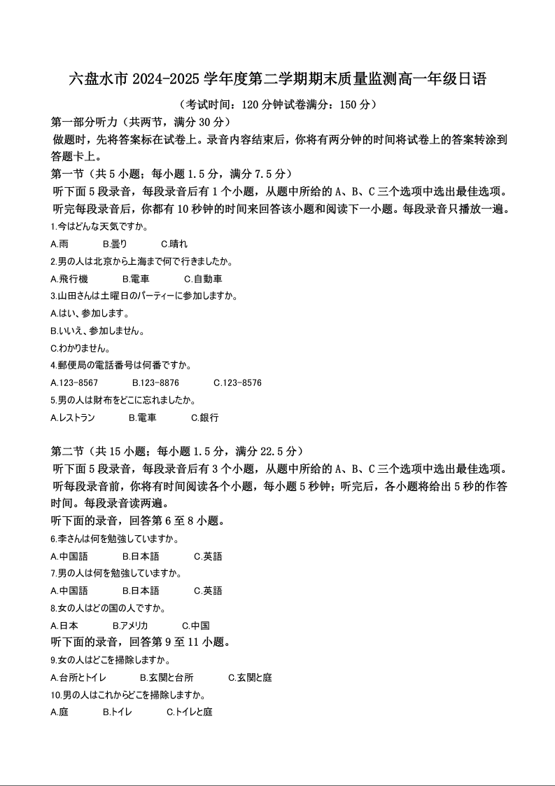 高一日语+答案--贵州省六盘水市2024-2025学年高一下学期期末质量监测