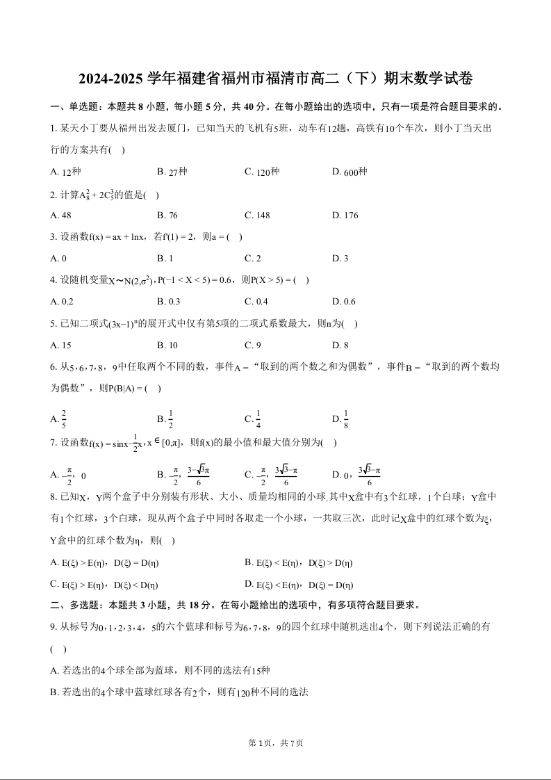 高二数学+答案--福建省福州市福清市2024-2025学年高二下学期期末质量检测