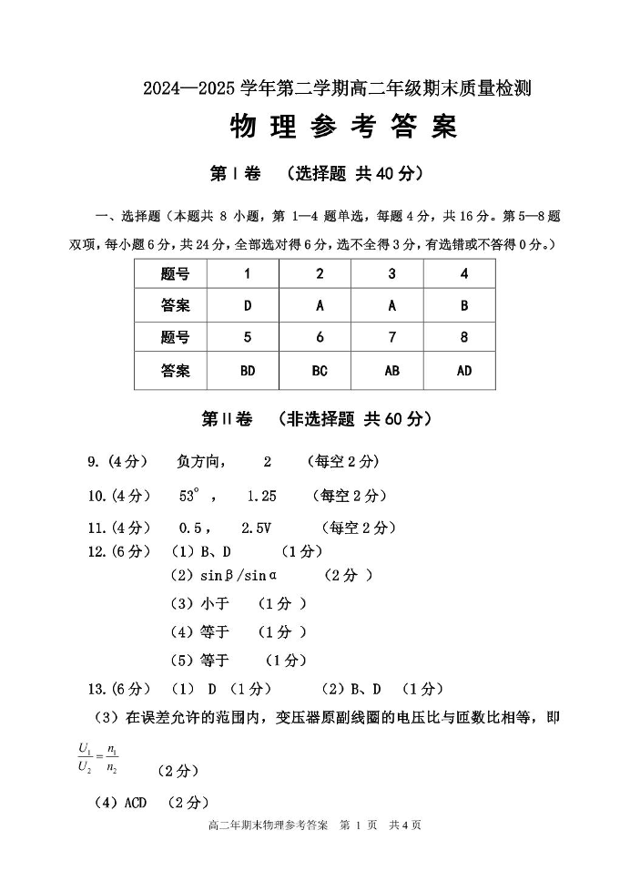 高二物理答案--福建省福州市福清市2024-2025学年高二下学期期末质量检测