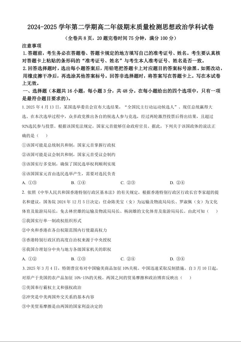 高二政治+答案--福建省福州市福清市2024-2025学年高二下学期期末质量检测