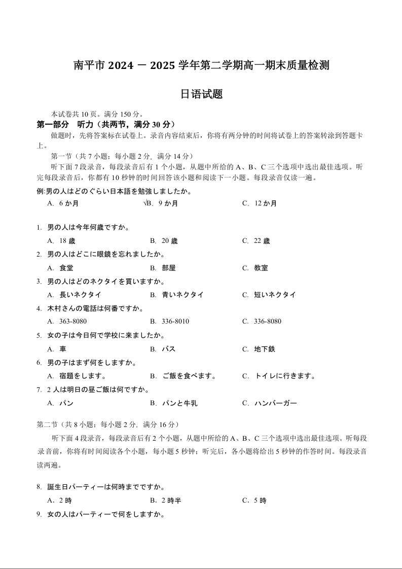 高一日语--福建省南平市2024-2025学年高一下学期期末考试