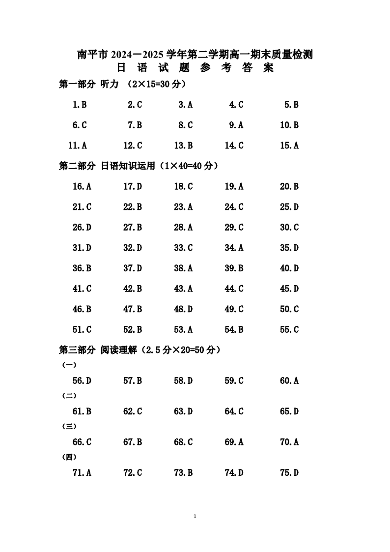 高一日语答案--福建省南平市2024-2025学年高一下学期期末考试