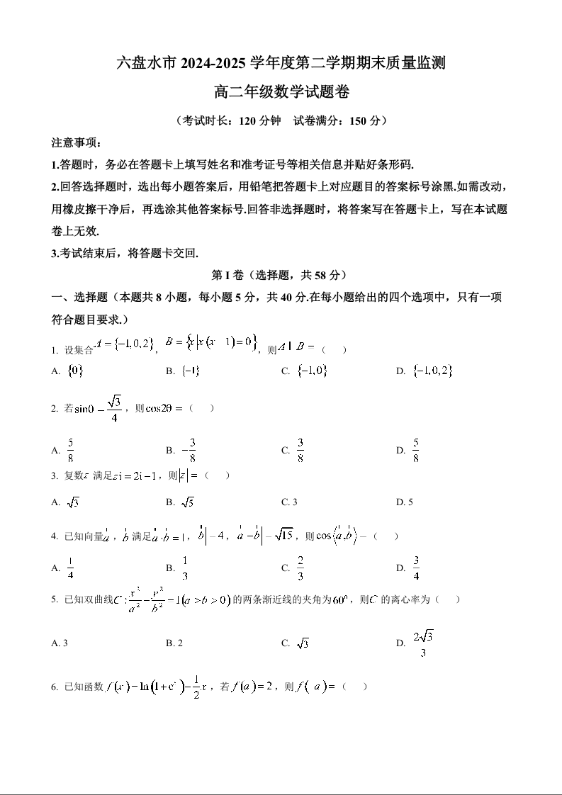 高二数学+答案--贵州省六盘水市2024-2025学年高二下学期期末质量监测