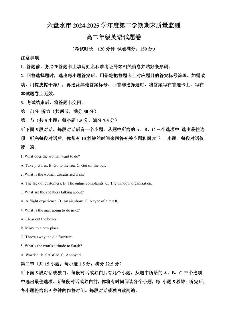 高二英语+答案--贵州省六盘水市2024-2025学年高二下学期期末质量监测