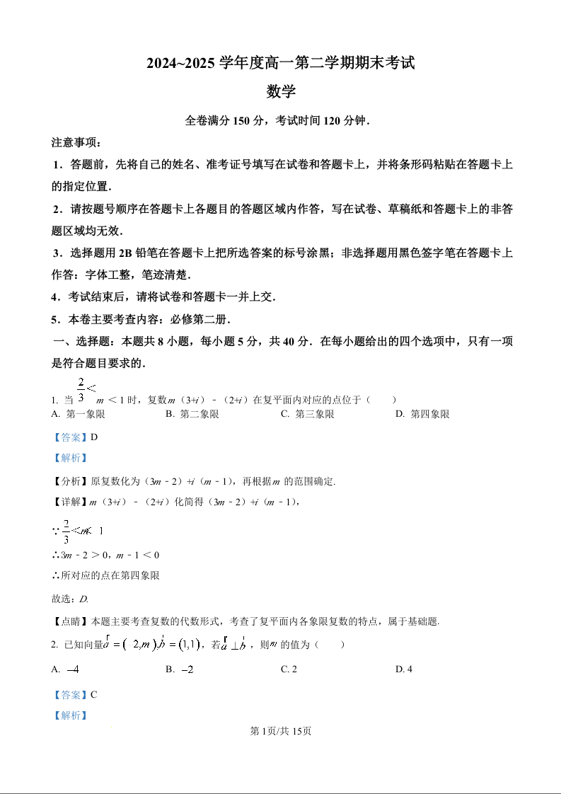 高一数学(精品解析版)--吉林省吉林市永吉实验高级中学等校2024-2025学年高一下学期期末联考