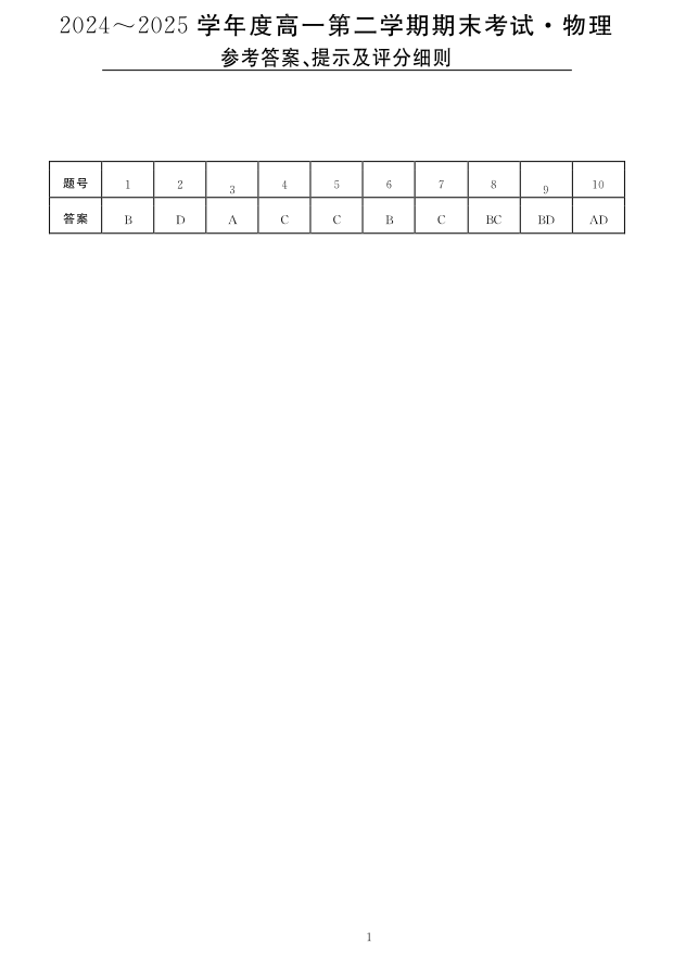 高一物理答案--吉林省吉林市永吉实验高级中学等校2024-2025学年高一下学期期末联考