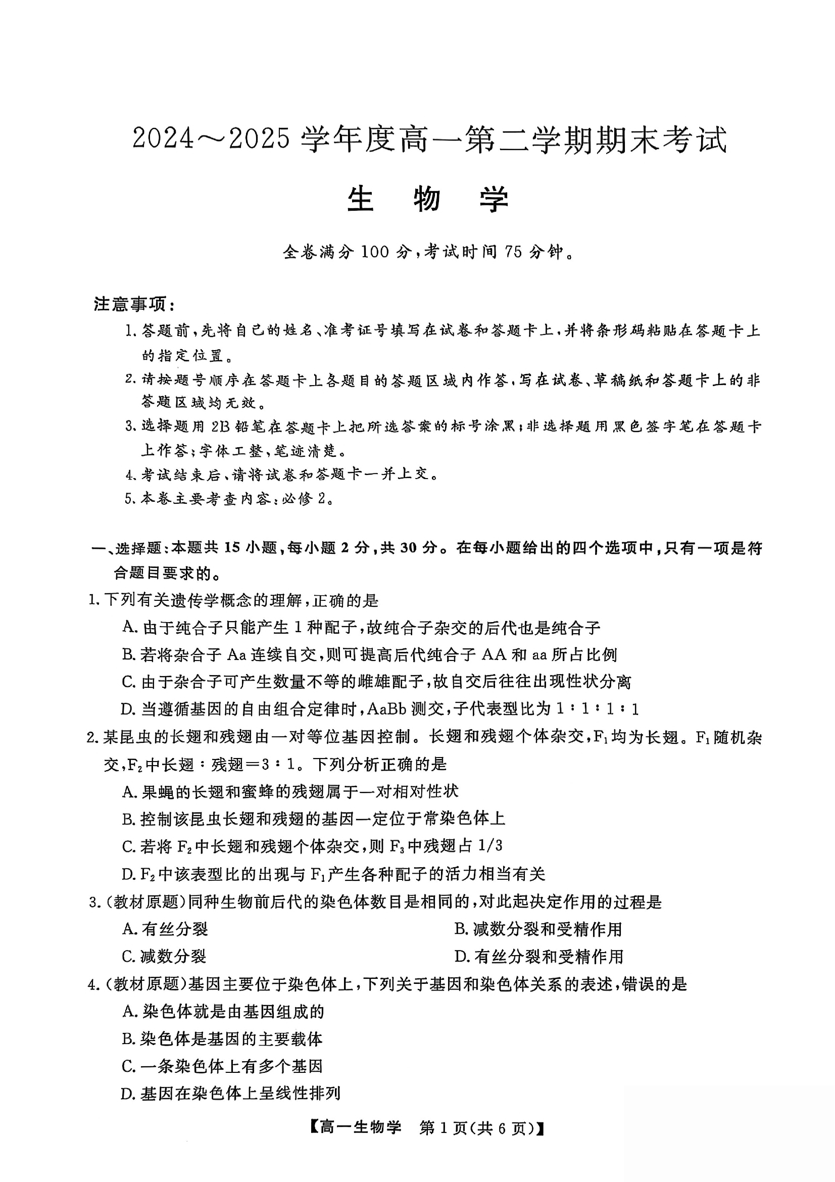 高一生物+答案--吉林省吉林市永吉实验高级中学等校2024-2025学年高一下学期期末联考