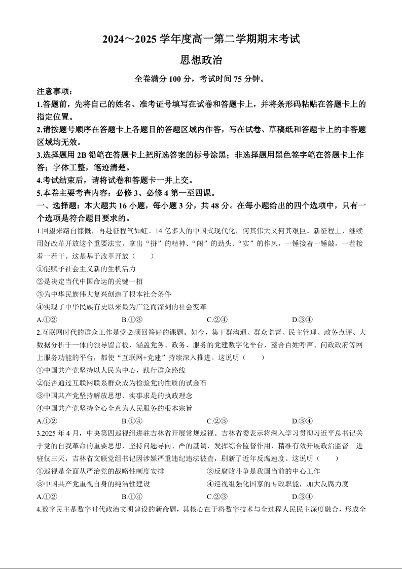 高一政治+答案--吉林省吉林市永吉实验高级中学等校2024-2025学年高一下学期期末联考