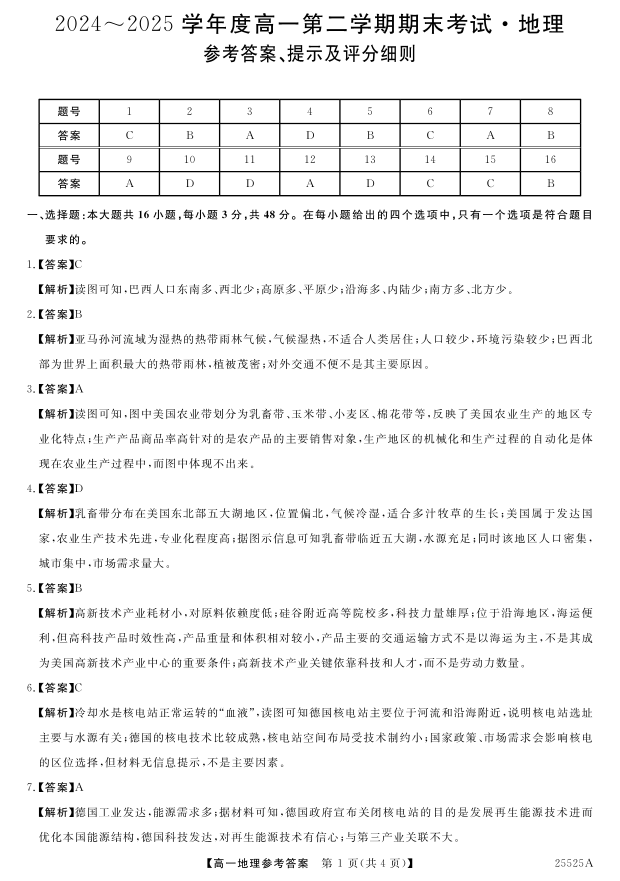 高一地理答案--吉林省吉林市永吉实验高级中学等校2024-2025学年高一下学期期末联考