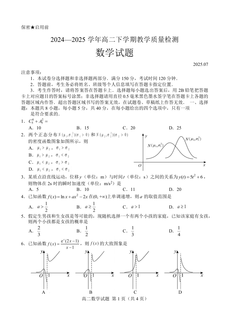 高二数学--山东省菏泽市2024-2025学年高二下学期期末考试