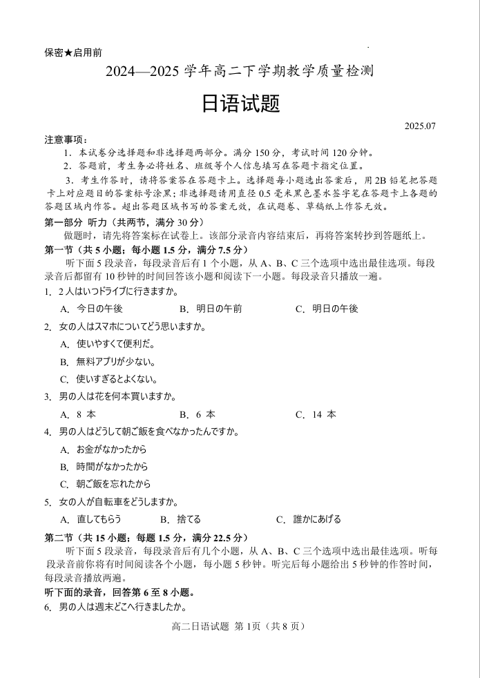 高二日语--山东省菏泽市2024-2025学年高二下学期期末考试