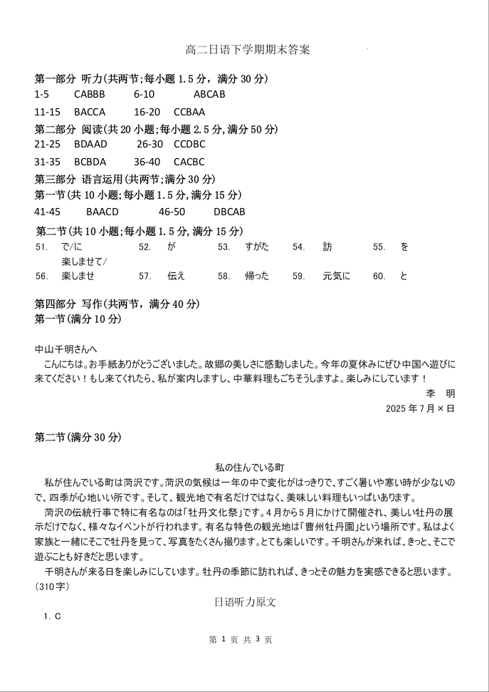 高二日语答案--山东省菏泽市2024-2025学年高二下学期期末考试