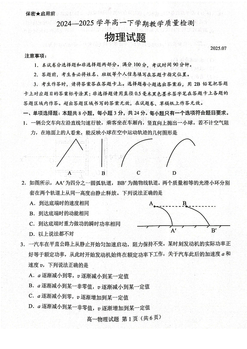 高一物理--山东省菏泽市2024-2025学年高一下学期期末考试