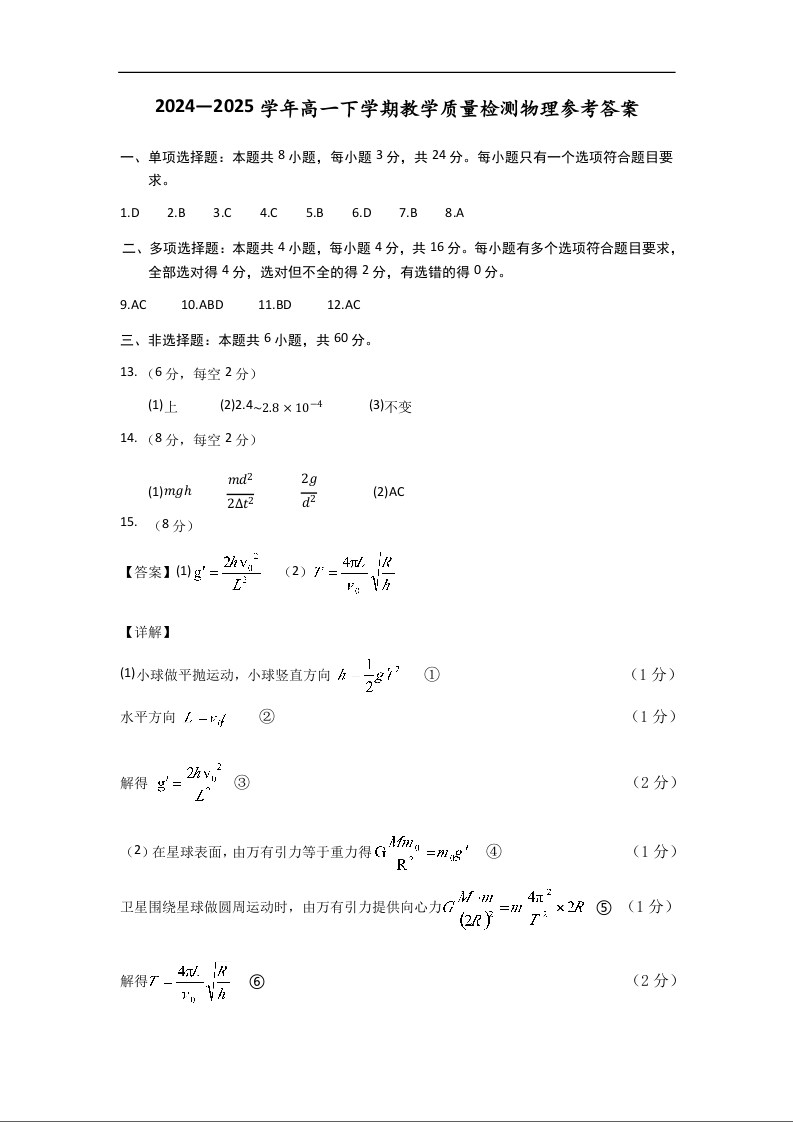 高一物理答案--山东省菏泽市2024-2025学年高一下学期期末考试