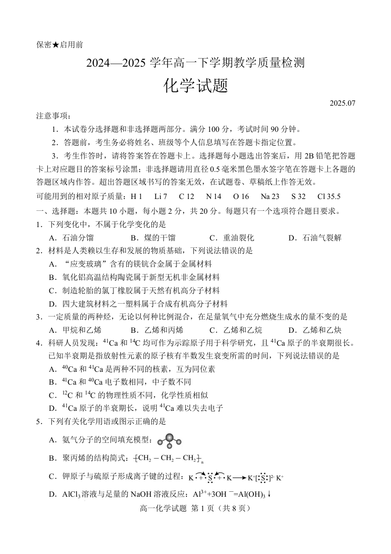 高一化学--山东省菏泽市2024-2025学年高一下学期期末考试