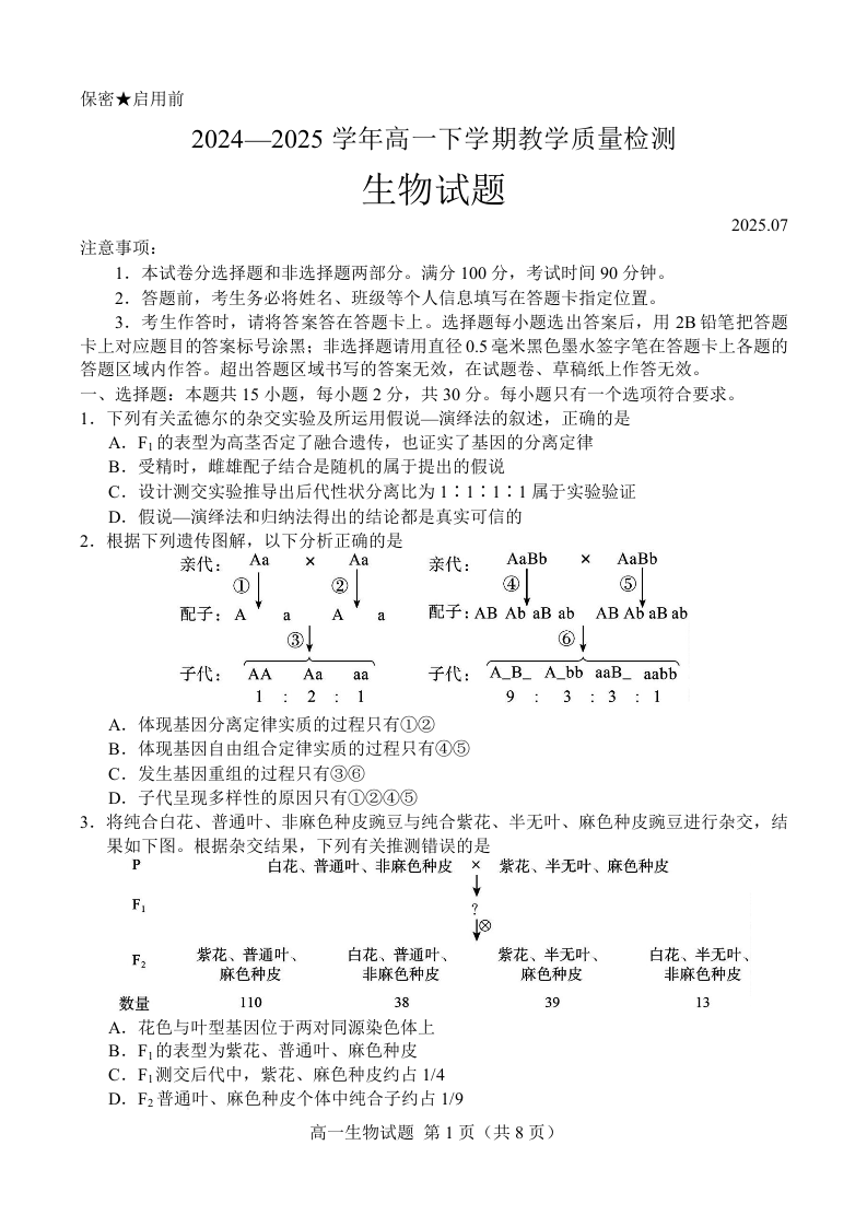 高一生物--山东省菏泽市2024-2025学年高一下学期期末考试