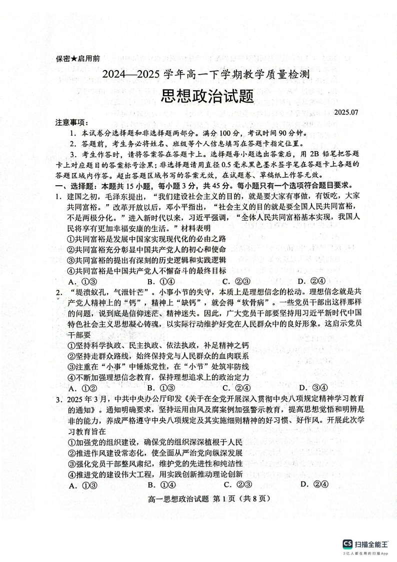 高一政治--山东省菏泽市2024-2025学年高一下学期期末考试