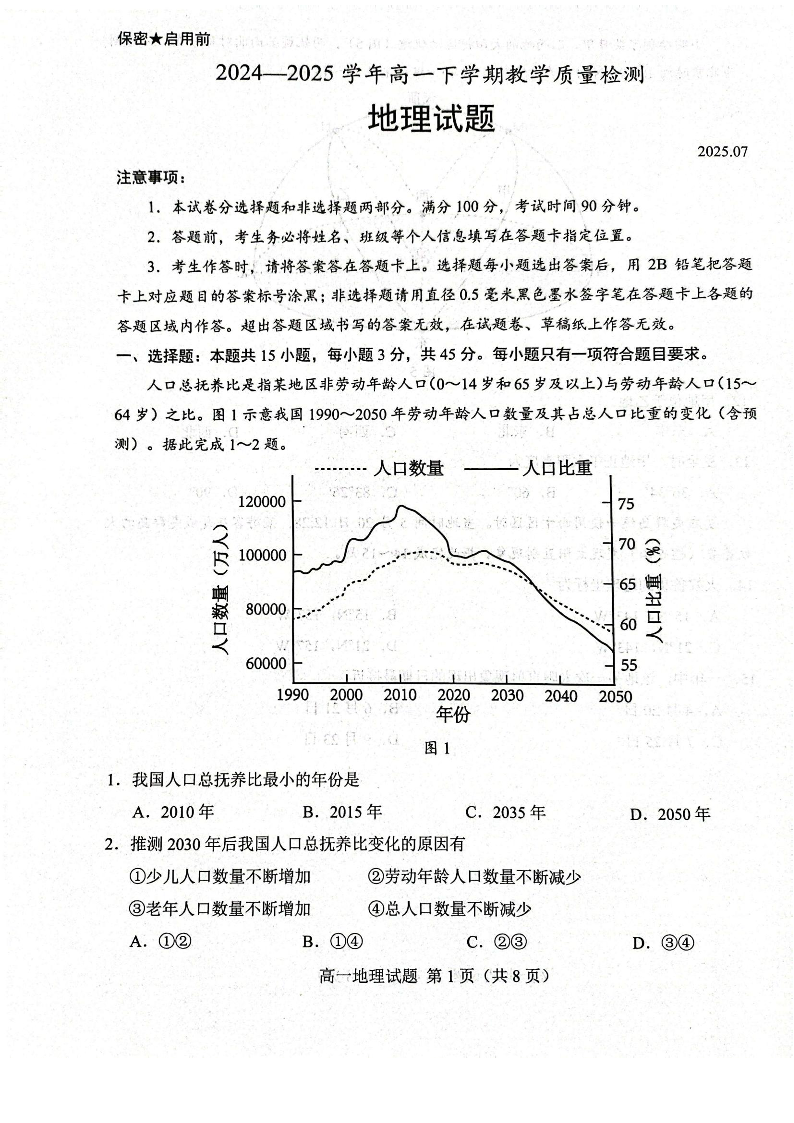 高一地理--山东省菏泽市2024-2025学年高一下学期期末考试