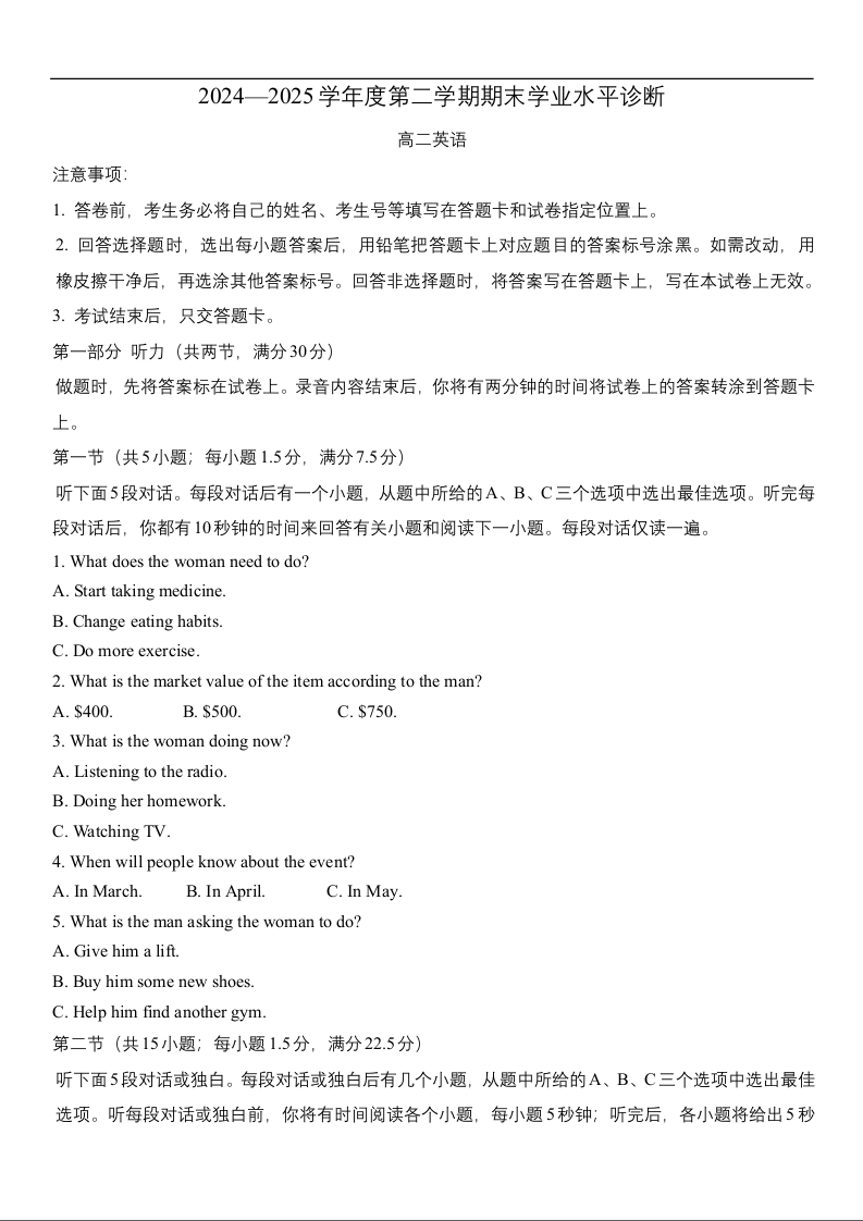 高二英语--山东省烟台市2024-2025学年高二下学期期末