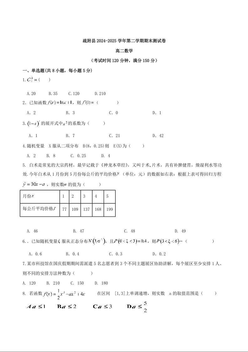 高二数学+答案--新疆喀什地区疏附县2024-2025学年高二下学期期末测试
