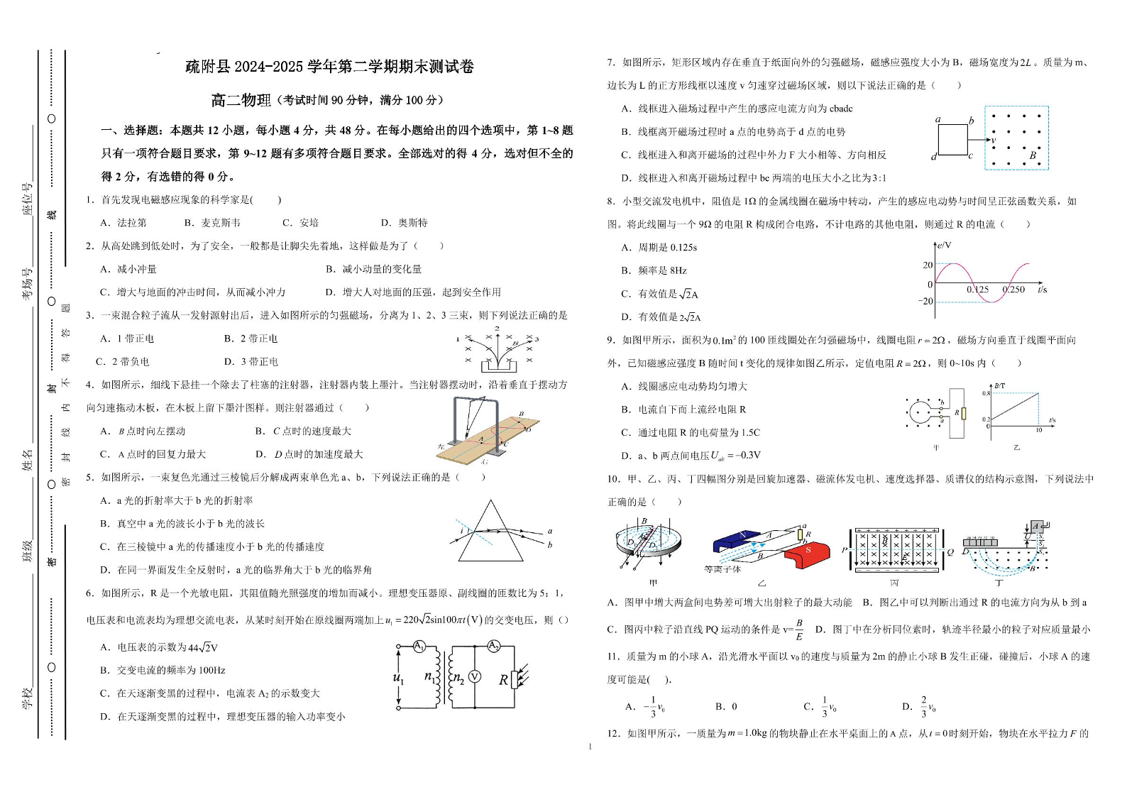 高二物理+答案--新疆喀什地区疏附县2024-2025学年高二下学期期末测试