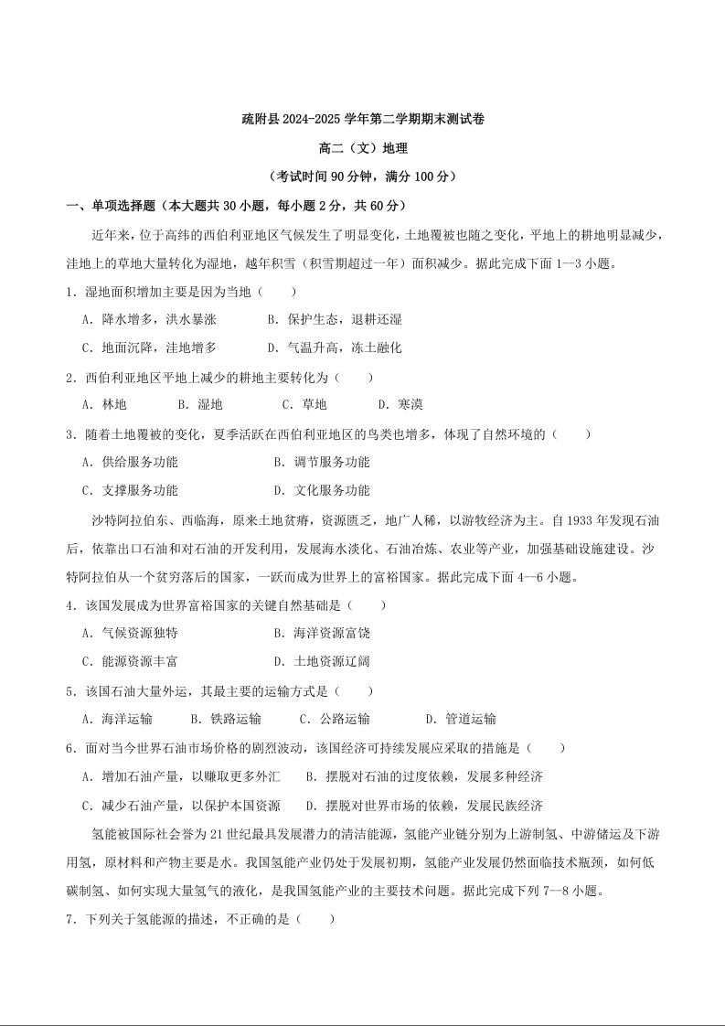 高二地理+答案--新疆喀什地区疏附县2024-2025学年高二下学期期末测试