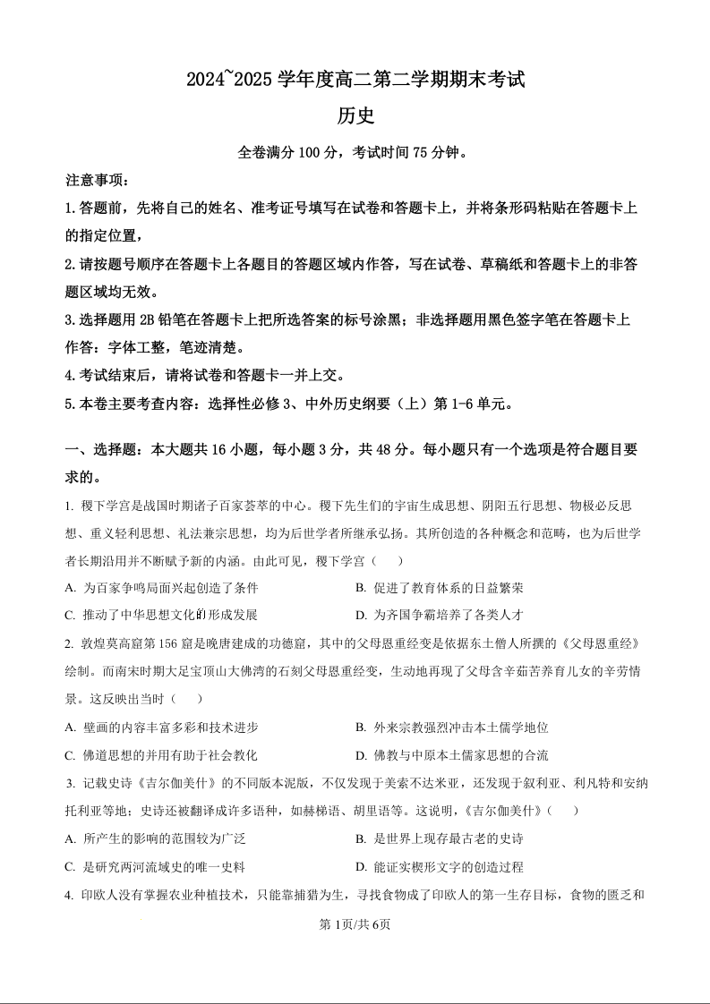 高二历史(原卷版)--吉林省吉林市永吉实验高级中学等校2024-2025学年高二下学期期末联考