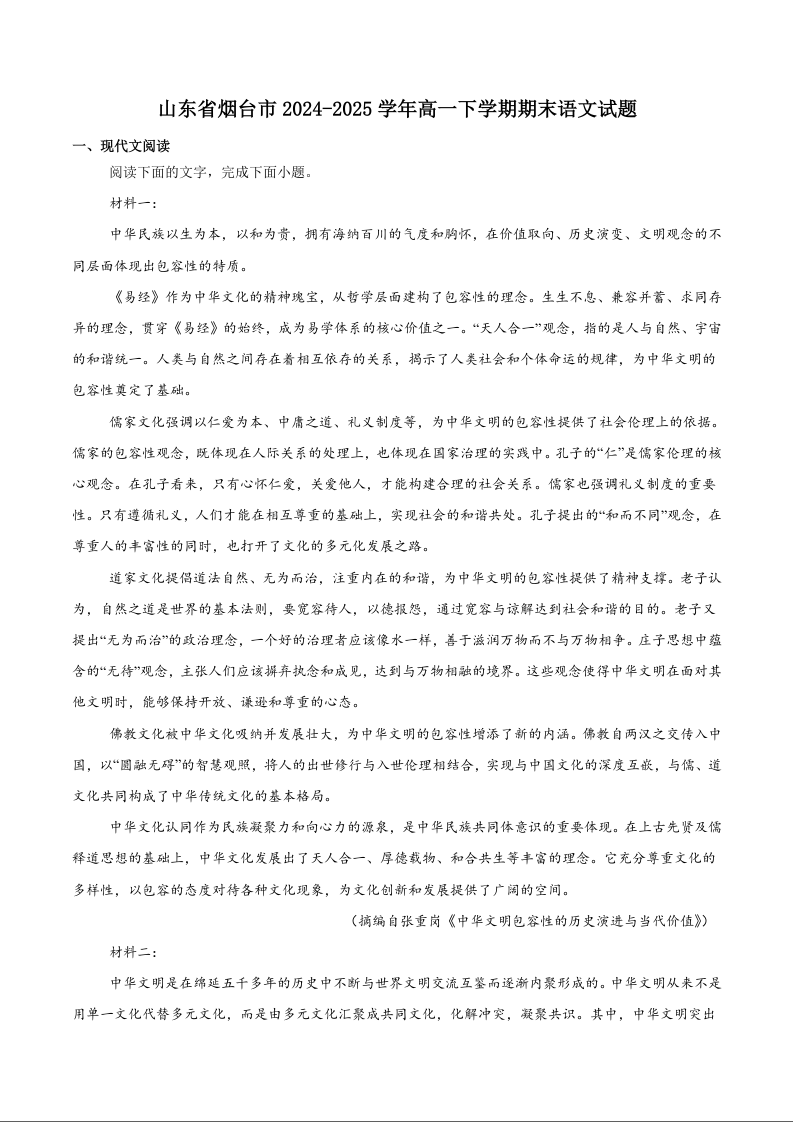 高一语文+答案--山东省烟台市2024-2025学年高一下学期期末