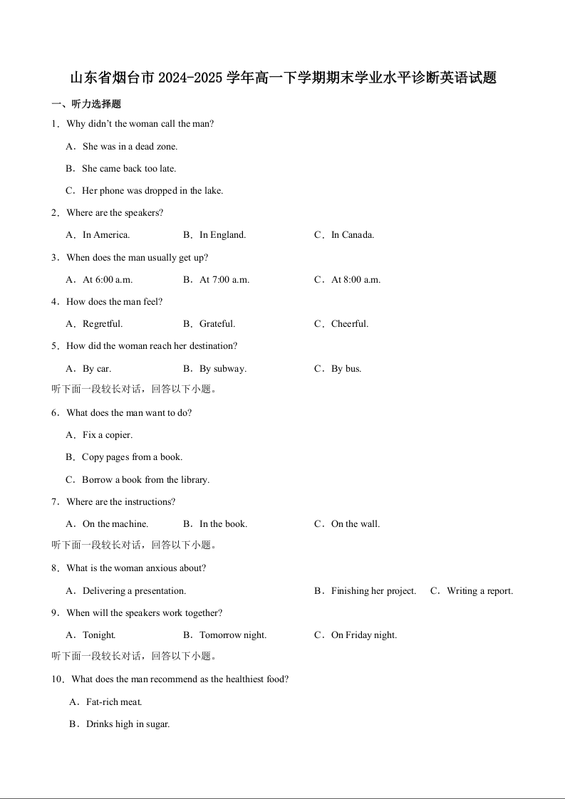 高一英语+答案--山东省烟台市2024-2025学年高一下学期期末