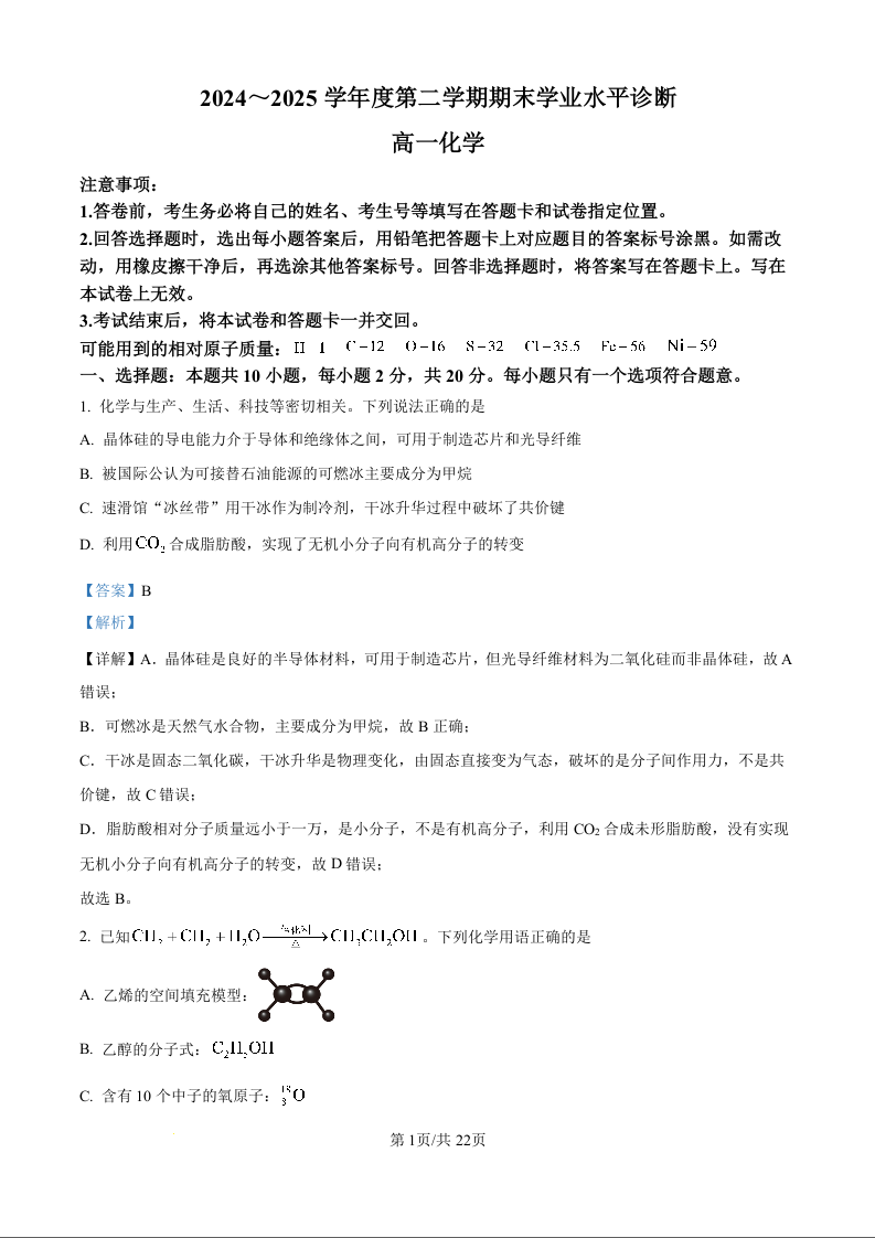 高一化学(精品解析版)--山东省烟台市2024-2025学年高一下学期期末