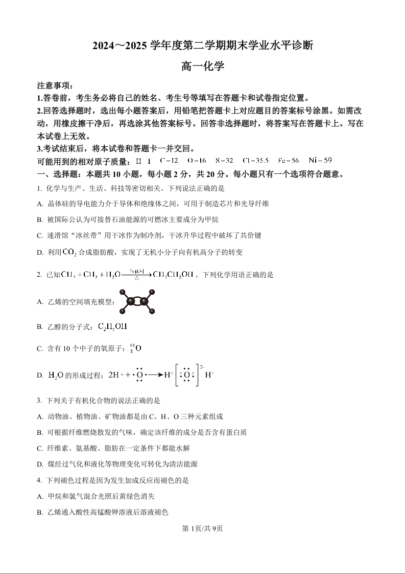高一化学(原卷版)--山东省烟台市2024-2025学年高一下学期期末