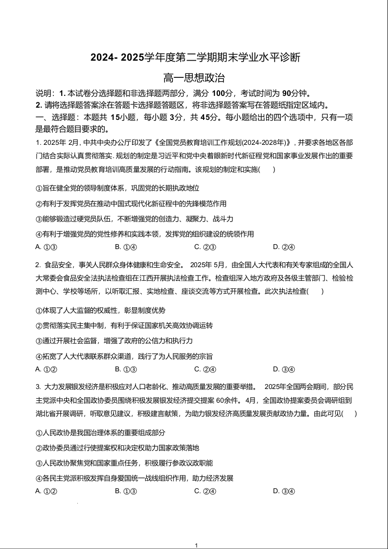 高一政治+答案--山东省烟台市2024-2025学年高一下学期期末