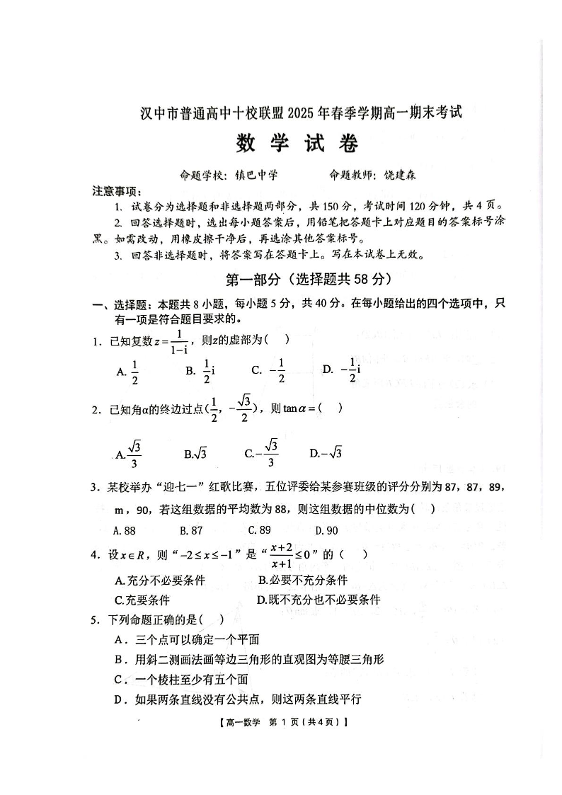高一数学+答案--陕西省汉中市普通高中十校联盟2024-2025学年高一下学期期末考试